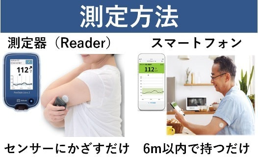 - 指に針を刺さずに、スマートフォンや専用の読取機で血糖値をかんたんに確認できます。